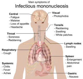 Infectious mononucleosis (IM, mono), also known as glandular fever, is an infection usually caused by the Epstein–Barr virus (EBV).[2][3] Most people are infected by the virus as children, when the disease produces few or no symptoms.[2] In young adults, the disease often results in fever, sore throat, enlarged lymph nodes in the neck, and tiredness.[2] Most people recover in two to four weeks; however, feeling tired may last for months.[2] The liver or spleen may also become swollen,[3] and in less than one percent of cases splenic rupture may occur.[6]