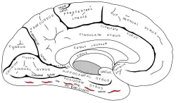 ![]() Medial surface of left cerebral hemisphere. The picture shows a special definition of "inferior temporal sulcus" (in red), which is more commonly known as the occipitotemporal sulcus.[1] In this special definition, the commonly known inferior temporal sulcus is labelled as "middle temporal sulcus".[2] | |