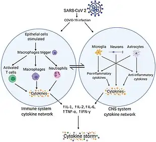 Cytokine Storm Induced by SARS-CoV2 InfectionInfection by SARS-COV 2 leads to COVID-19 Infection resulting in activation of inflammatory phenotypes by cell types in both the central nervous system and within the immune system network
