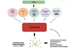 Inflammaging (also known as inflamm-aging or inflamm-ageing) is a chronic, sterile, low-grade inflammation that develops with advanced age, in the absence of overt infection, and may contribute to clinical manifestations of other age-related pathologies. Inflammaging is thought to be caused by a loss of control over systemic inflammation resulting in chronic overstimulation of the innate immune system. Inflammaging is a significant risk factor in mortality and morbidity in aged individuals.[2][3][4]