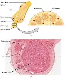 Each nerve is covered on the outside by a dense sheath of connective tissue, the epineurium. Beneath this is a layer of fat cells, the perineurium, which forms a complete sleeve around a bundle of axons. Perineurial septae extend into the nerve and subdivide it into several bundles of fibres. Surrounding each such fibre is the endoneurium. This forms an unbroken tube from the surface of the spinal cord to the level where the axon synapses with its muscle fibres, or ends in sensory receptors. The endoneurium consists of an inner sleeve of material called the glycocalyx and an outer, delicate, meshwork of collagen fibres.[2] Nerves are bundled and often travel along with blood vessels, since the neurons of a nerve have fairly high energy requirements.