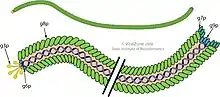 Filamentous bacteriophages are a family of viruses (Inoviridae) that infect bacteria, or bacteriophages. They are named for their filamentous shape, a worm-like chain (long, thin and flexible, reminiscent of a length of cooked spaghetti), about 6 nm in diameter and about 1000-2000 nm long.[1][2][3][4][5] This distinctive shape reflects their method of replication: the coat of the virion comprises five types of viral protein, which are located in the inner membrane of the host bacterium during phage assembly, and these proteins are added to the nascent virion's DNA as it is extruded through the membrane. The simplicity of filamentous phages makes them an appealing model organism for research in molecular biology, and they have also shown promise as tools in nanotechnology and immunology.