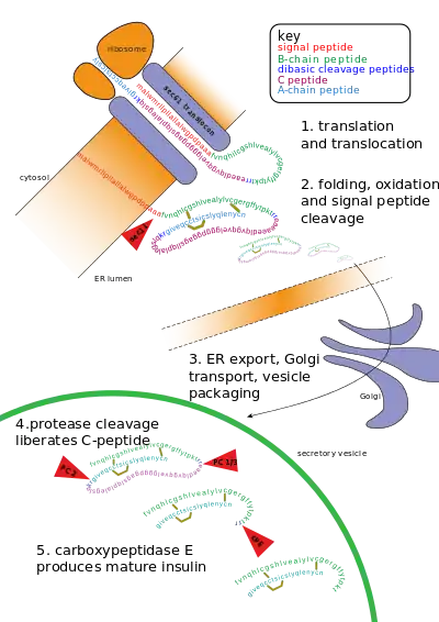 Insulin is synthesized as an inactive precursor molecule, a 110 amino acid-long protein called "preproinsulin". Preproinsulin is translated directly into the rough endoplasmic reticulum (RER), where its signal peptide is removed by signal peptidase to form "proinsulin".[26] As the proinsulin folds, opposite ends of the protein, called the "A-chain" and the "B-chain", are fused together with three disulfide bonds.[26] Folded proinsulin then transits through the Golgi apparatus and is packaged into specialized secretory vesicles.[26] In the granule, proinsulin is cleaved by proprotein convertase 1/3 and proprotein convertase 2, removing the middle part of the protein, called the "C-peptide".[26] Finally, carboxypeptidase E removes two pairs of amino acids from the protein's ends, resulting in active insulin – the insulin A- and B- chains, now connected with two disulfide bonds.[26]