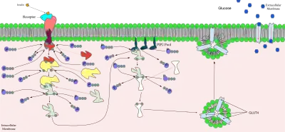 The insulin signal transduction pathway begins when insulin binds to the insulin receptor proteins. Once the transduction pathway is completed, the GLUT-4 storage vesicles becomes one with the cellular membrane. As a result, the GLUT-4 protein channels become embedded into the membrane, allowing glucose to be transported into the cell.