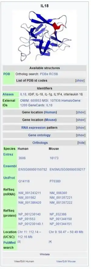- ↑ "Entrez Gene: IL18 interleukin 18 (interferon-gamma-inducing factor)". Archived from the original on 2024-01-24. Retrieved 2023-12-25.