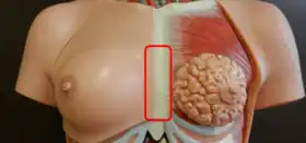 The intermammary cleft, intermammary sulcus, or sulcus intermammarius is a surface feature of males and females that marks the division of the two breasts with the sternum (breastbone) in the middle.[1][2][3][4][5] The International Federation of Associations of Anatomists (IFAA) uses the terms "sulcus intermammarius" or "intermammary cleft" when referring to the area between the breasts.[6][7][8]