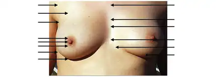 A dense structure of Cooper's ligaments is medially inserted into the skin overlying the sternum, determining the shape of the breasts and intermammary sulcus.[24] These ligaments helpful in supporting the breasts in an youthful disposition; loss of elasticity or attenuation of these ligaments results in ptosis (sagging) of breasts.[25][26]