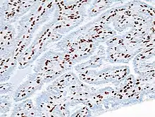 Histopathology of intraductal papilloma of the breast by excisional biopsy. Immunostaining for p63 protein. | |