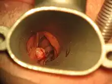 Laryngoscopic view of the vocal process. An intubation granuloma is visible as a pale nodule on the left posterior laryngeal wall.