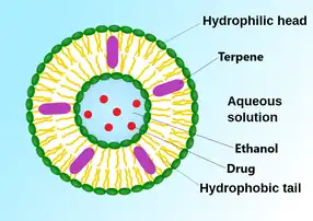 Invasome vesicular systems are artificial vesicles composed of phospholipids, terpene, and ethanol.[1] A phospholipid bilayer creates the external structure of the spherical particle. Within the bilayer are terpenes. Terpenes are naturally-occurring hydrocarbon chains that are commonly used in aromatics and scent products, but also have been used for the development of pharmaceuticals. Within the center of the terpene-and-phospholipid bilayer is a core that contains an aqueous hydroethanolic solution, along with the relevant drug.[1][2]