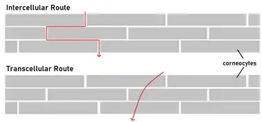 Penetration of the stratum corneum is recognized as the largest challenge of TDD. Due to its tight cell structure, it is the rate limiting barrier for drug absorption. Thus, several methods of penetrating the stratum corneum have been explored. A couple of common methods include delivery through the intercellular route and the transcellular route. The roundabout, intercellular route seeks to bypass the corneocytes by transporting molecules through the lipid-rich intercellular space between the cells. The transcellular route seeks to transport molecules directly through the cells of the stratum corneum. In this method, molecules must travel through both corneocytes and the intercellular lipid space. The method of choice is dependent on physical and chemical properties of the transporting compounds; however, the intercellular route is the most common. Thus, the intercellular lipid barrier has been a subject of investigation to allow for greater understanding of how to develop transportation mechanisms of molecules through the stratum corneum.[3][5]