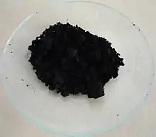 Iron(II,III) oxide, or black iron oxide, is the chemical compound with formula Fe3O4. It occurs in nature as the mineral magnetite. It is one of a number of iron oxides, the others being iron(II) oxide (FeO), which is rare, and iron(III) oxide (Fe2O3) which also occurs naturally as the mineral hematite. It contains both Fe2+ and Fe3+ ions and is sometimes formulated as FeO  Fe2O3. This iron oxide is encountered in the laboratory as a black powder. It exhibits permanent magnetism and is ferrimagnetic, but is sometimes incorrectly described as ferromagnetic.[4] Its most extensive use is as a black pigment (see: Mars Black). For this purpose, it is synthesized rather than being extracted from the naturally occurring mineral as the particle size and shape can be varied by the method of production.[5]