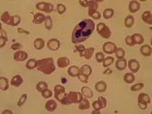The blood smear of a person with iron-deficiency anemia shows many hypochromic (pale, relatively colorless) and small red blood cells, and may also show poikilocytosis (variation in shape) and anisocytosis (variation in size).[17][51] Target cells may also be seen. With more severe iron-deficiency anemia, the peripheral blood smear may show hypochromic, pencil-shaped cells and, occasionally, small numbers of nucleated red blood cells.[55] The platelet count may be slightly above the high limit of normal in iron-deficiency anemia (termed a mild thrombocytosis), but severe cases can present with thrombocytopenia (low platelet count).[56]