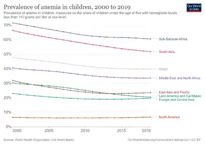- ↑ Chaparro CM, Suchdev PS (August 2019). "Anemia epidemiology, pathophysiology, and etiology in low- and middle-income countries". Annals of the New York Academy of Sciences. 1450 (1): 15–31. doi:10.1111/nyas.14092. PMC 6697587. PMID 31008520.