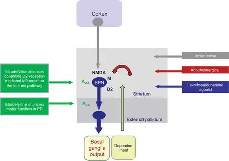 - ↑ Jenner, Peter; Mori, Akihisa; Aradi, Stephen D.; Hauser, Robert A. (4 March 2021). "Istradefylline – a first generation adenosine A 2A antagonist for the treatment of Parkinson's disease". Expert Review of Neurotherapeutics. 21 (3): 317–333. doi:10.1080/14737175.2021.1880896. ISSN 1473-7175.