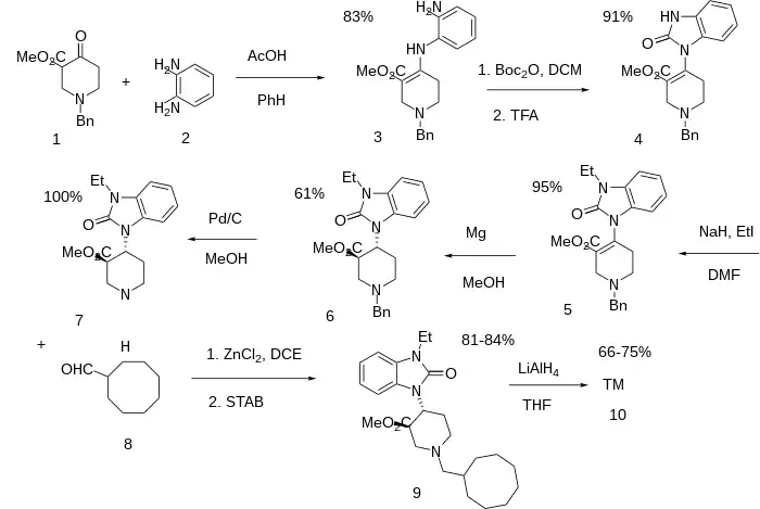 Condensation between 1-Benzyl-3-methoxycarbonyl-4-piperidone [57611-47-9] (1) and O-Phenylenediamine (2) gives CID:16726310 (3). Reaction with boc anhydride followed by treatment with trifluoroacetic acid gives CID:16726358 (4). Reaction with iodoethane in the presence of base alkylates the urea nitrogen giving CID:16726359 (5). Reduction of the enamine by treatment with magnesium metal in methanol solvent occurs to give predominantly the trans isomer, CID:16726360 (6). Catalytic removal of the benzyl group gives CID:16726362 (7). Reductive amination with Cyclooctanecarbaldehyde [6688-11-5] (7) gives CID:16726364 (9). Lastly, reduction of the ester with lithium aluminium hydride completed the synthesis of J-113397 (10).