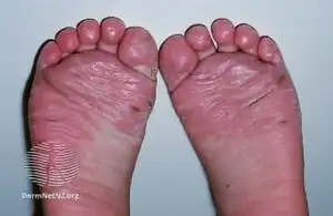Juvenile plantar dermatosis is a condition usually seen in children between the ages of 3 and 14, and involves the cracking and peeling of weight bearing areas of the soles of the feet.[2] One of the earliest descriptions was made by British dermatologist Darrell Wilkinson.[3]