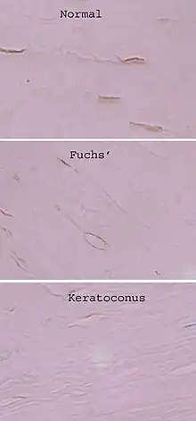 Alcohol dehydrogenase immunoreactivity in a healthy cornea (top), in Fuchs' dystrophy and keratoconic cornea. Diaminobenzidine stains keratocytes in the cross-section of cornea. From Mootha et al., 2009.[14]
