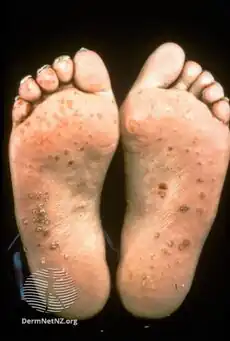 Keratoderma blennorrhagicum etymologically meaning keratinized (kerato-) skin (derma-) mucousy (blenno-) discharge (-rrhagia) (also called keratoderma blennorrhagica)[1] are skin lesions commonly found on the palms and soles but which may spread to the scrotum, scalp and trunk. The lesions may resemble psoriasis.[2]: 195