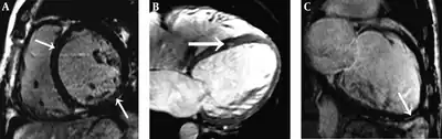 Individual with a diffuse form of Keshan disease a) Short-axis, b) four-chamber c)long-axis delayed-enhancement | |