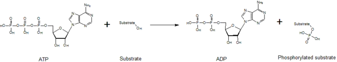 Kinases mediate the transfer of a phosphate moiety from a high energy molecule (such as ATP) to their substrate molecule, as seen in the figure below. Kinases are needed to stabilize this reaction because the phosphoanhydride bond contains a high level of energy. Kinases properly orient their substrate and the phosphoryl group within their active sites, which increases the rate of the reaction. Additionally, they commonly use positively charged amino acid residues, which electrostatically stabilize the transition state by interacting with the negatively charged phosphate groups. Alternatively, some kinases utilize bound metal cofactors in their active sites to coordinate the phosphate groups. Protein kinases can be classed as catalytically active (canonical) or as pseudokinases, reflecting the evolutionary loss of one or more of the catalytic amino acids that position or hydrolyse ATP.[6] However, in terms of signalling outputs and disease relevance, both kinases and pseudokinases are important signalling modulators in human cells, making kinases important drug targets.[7]