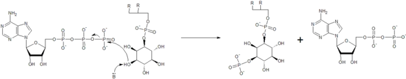 The kinase enzymes increase the rate of the reactions by making the inositol hydroxyl group more nucleophilic, often using the side chain of an amino acid residue to act as a general base and deprotonate the hydroxyl, as seen in the mechanism below.[24] Here, a reaction between adenosine triphosphate (ATP) and phosphatidylinositol is coordinated. The end result is a phosphatidylinositol-3-phosphate as well as adenosine diphosphate (ADP). The enzymes can also help to properly orient the ATP molecule, as well as the inositol group, to make the reaction proceed faster. Metal ions are often coordinated for this purpose.[24]