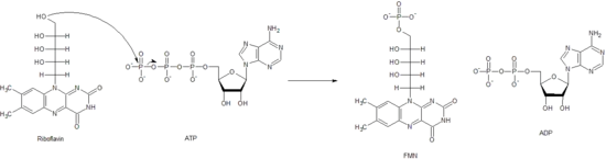 Riboflavin kinase catalyzes the phosphorylation of riboflavin to create flavin mononucleotide(FMN). It has an ordered binding mechanism where riboflavin must bind to the kinase before it binds to the ATP molecule.[31] Divalent cations help coordinate the nucleotide.[31] The general mechanism is shown in the figure below.