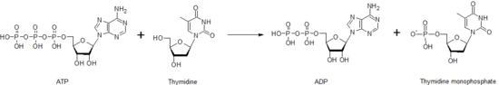 Thymidine kinase is one of the many nucleoside kinases that are responsible for nucleoside phosphorylation. It phosphorylates thymidine to create thymidine monophosphate (dTMP). This kinase uses an ATP molecule to supply the phosphate to thymidine, as shown below. This transfer of a phosphate from one nucleotide to another by thymidine kinase, as well as other nucleoside and nucleotide kinases, functions to help control the level of each of the different nucleotides.