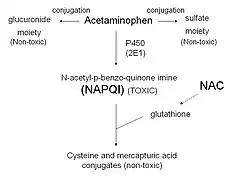 Acetaminophen (or paracetamol) is an analgesic medication that can affect the liver when administered in high doses. Acetaminophen is predominantly conjugated into glucuronate and sulfate moieties by Phase II metabolism. A small percentage is metabolized by the cytochrome P450 pathway to a toxic metabolite, NAPQI. NAPQI is conjugated by glutathione to non-toxic cysteine and mercapturic acid moieties. In cases of acetaminophen toxicity, the Phase II conjugation enzymes are saturated, and a higher fraction is converted to NAPQI. The conjugation of NAPQI to glutathione occurs until glutathione is depleted from hepatic reserves, after which the toxic NAPQI accumulates and causes damage to the hepatocytes. This occurs primarily in areas of the liver that are relatively poorly perfused with oxygen, or furthest away from the hepatic artery, termed Zone 3. Acetaminophen overdose is associated with Zone 3 necrosis, to the point that acute liver failure may result.[3]