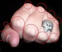 ![]() The major knuckles of the hand (encircled in red) | |