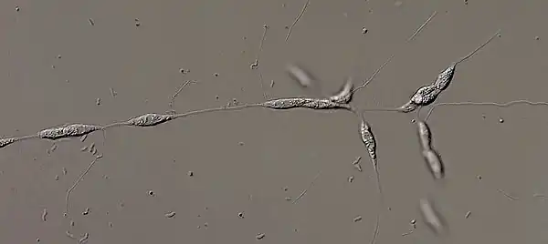 The morphology of the zoospore is similar to a "standard" stramenopile cell. Zoospores contain an eyespot and two flagella. Only the anterior flagellum is covered with mastigonemes and the posterior flagellum propels the cell through the ectoplasmic net. Both flagella are inserted laterally and medially. After about 24 hours, the zoospores lose their flagella and round up to finally differentiate into vegetative spindle cells.[15][14] Vegetative cells stop gliding through the net in older cultures or under bad conditions. Only few of the older cells autolyze, but most of them round up.[16]