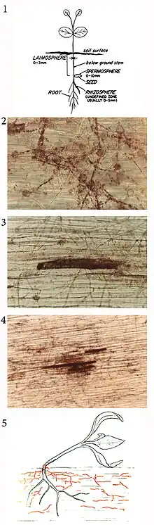The laimosphere is the microbiologically enriched zone of soil that surrounds below-ground portions of plant stems; the laimosphere is analogous to the rhizosphere and spermosphere. The combining form laim- from laimos (Greek: λαιμός, "throat") denotes a connecting organ (neck) while -sphere indicates a zone of influence. Topographically, the laimosphere includes the soil around any portion of subterranean plant organs other than roots where exuded nutrients (especially sugars and amino acids) stimulate microbial activities. Subterranean plant organs with a laimosphere include hypocotyls, epicotyls, stems, stolons, corms, bulbs, and leaves. Propagules of soil-borne plant pathogens, whose germination is stimulated by a plant exudates in the laimosphere, can initiate hypocotyl and stem rots leading to "damping-off". Pathogens commonly found to cause such diseases are species of Fusarium, Phoma, Phytophthora, Pythium, Rhizoctonia and Sclerotinia.