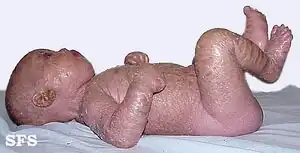- 1 2 3 4 Van Gysel D, Lijnen RL, Moekti SS, de Laat PC, Oranje AP (September 2002). "Collodion baby: a follow-up study of 17 cases". J Eur Acad Dermatol Venereol. 16 (5): 472–5. doi:10.1046/j.1468-3083.2002.00477.x. PMID 12428840. S2CID 12110995.