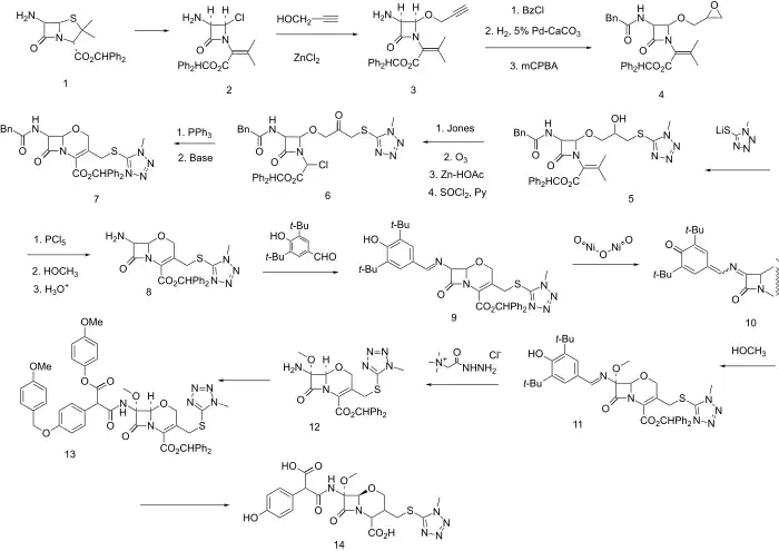 The benzhydrol ester of 6-Aminopenicillanic acid (6-APA) is S-chlorinated and treated with base whereupon the intermediate sulfenyl chloride fragments (to 2). Next, displacement with propargyl alcohol in the presence of zinc chloride gives predominanntly the stereochemistry represented by diastereoisomer 3. The side chain is protected as the phenylacetylamide; the triple bond is partially reduced with a 5% Pd-CaCO3 (Lindlar catalyst) and then epoxidized with mCPBA to give 4. The epoxide is opened at the least hindered end with 1-methyl-1H-tetrazole-5-thiol to put in place the future C-3 side chain and give intermediate 5. Jones oxidation followed in turn by ozonolysis (reductive work-up with zinc-AcOH) and reaction with SOCl2 and pyridine give halide 6. The stage is now wet for intramolecular Wittig reaction. Displacement with PPh3 and Wittig olefination gives 1-oxacephem 7. Next a sequence is undertaken of side chain exchange and introduction of a 7-methoxyl group analogous to that which is present in cephamycins and gives them the enhanced beta-lactamase stability. First 7 is converted to the imino chloride with PCl5 and then to the imino methyl ether (with methanol) and next hydrolyzed to the free amine (8). Imine formation with 3,5-di-t-butyl-4-hydroxybenzaldehyde is next carried out leading to 9. Oxidation with nickel(III) oxide gives iminoquinone methide 10, to which methanol is added in a conjugate sense and in the sterechemistry represented by formula 11. The imine is exchanged with Girard's reagent T to give 12, and this is acylated by a suitable protected arylmalonate, as the hemiester hemiacid chloride so as to give 11. Deblocking with aluminium chloride and anisole gives moxalactam 14.