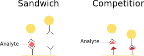Competitive assays are generally used for smaller analytes since smaller analytes have fewer binding sites.[19] The sample first encounters antibodies to the target analyte labelled with a visual tag (colored particles). The test line contains the target analyte fixed to the surface. When the target analyte is absent from the sample, unbound antibody will bind to these fixed analyte molecules, meaning that a visual marker will show. Conversely, when the target analyte is present in the sample, it binds to the antibodies to prevent them binding to the fixed analyte in the test line, and thus no visual marker shows. This differs from sandwich assays in that no band means the analyte is present.[2][19]