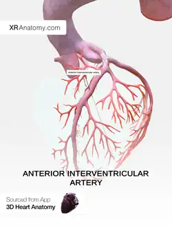 It first passes at posterior to the pulmonary artery, then passes anteriorward between that pulmonary artery and the left atrium to reach the anterior interventricular sulcus, along which it descends to the notch of cardiac apex. In 78% of cases, it reaches the apex of the heart.