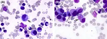 Granulocytes selectively kill the promastigotes by oxidative mechanism, while amastigotes are resistant.[18] Then the surviving amastigotes undergo cell division using simple binary fission. Multiplication continues until the host cell can no longer hold and ruptures. In a fully congested cell there can be as many as 50 to 200 amastigotes, which are released into tissue cavities. Each individual amastigote is then capable of invading fresh cells. As a result, the entire tissue is progressively infected and destroyed. A number of free amastigotes then enters the blood stream where many are phagocytosed by macrophages. These free and phagocytosed amastigotes in peripheral blood are then sucked up by blood-feeding sandfly.[19][20][21]