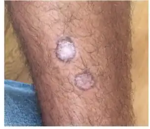 Upon becoming infected, patients usually present with lesions at the site of the sand fly bite. The infection is acute, and usually has a duration of about 3–6 months.[4] As more and more phagocytic cells engulf promastigotes, prompting the production of amastigotes, nodules form on the skin.[5] These nodules then ulcerate, although due to the variable characteristics of the lesions, species specific identification of the pathogen is impossible.[5] Generally though, lesions appear moist and have raised outer borders, a granulating base, an overlying layer of white purulent exudate, and have been described as "pizza-like."[4][5] Biopsies of these lesions usually reveal a number of findings including numerous macrophages containing intracellular amastigotes as well as lymphocytes with observed granuloma formation and few parasites.[22]