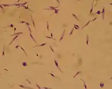 Leishmania major is a species of parasite found in the genus Leishmania, and is associated with the disease zoonotic cutaneous leishmaniasis (also known as Aleppo boil, Baghdad boil, Bay sore, Biskra button, Chiclero ulcer, Delhi boil, Kandahar sore, Lahore sore, Oriental sore, Pian bois, and Uta).[1] L. major is an intracellular pathogen which infects the macrophages and dendritic cells of the immune system.[2] Though Leishmania species are found on every continent aside from Antarctica, Leishmania major is found only in the Eastern Hemisphere, specifically in Northern Africa,[3] the Middle East, Northwestern China, and Northwestern India.[4][5]