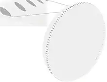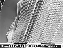 The lens capsule is a smooth, transparent basement membrane that completely surrounds the lens. The capsule is elastic and its main structural component is collagen. It is presumed to be synthesized by the lens epithelium and its main components in order of abundance are heparan sulfate proteoglycan (sulfated glycosaminoglycans (GAGs)), entactin, type IV collagen, laminin.[6] The capsule is very elastic and so allows the lens to assume a more spherical shape when the tension of the suspensory ligaments is reduced. The human capsule varies from 2 to 28 micrometres in thickness, being thickest near the equator (peri-equatorial region) and generally thinner near the posterior pole.[4] The photo from an electron microscope shows an area of the capsule near the equator where one of the thousands of suspensory ligaments attach.[7]