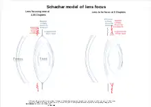 Schachar has proposed a model for land based vertebrates that was not well received.[30] The theory allows mathematical modeling to more accurately reflect the way the lens focuses while also taking into account the complexities in the suspensory ligaments and the presence of radial as well as circular muscles in the ciliary body.[31][32] In this model the ligaments may pull to varying degrees on the lens at the equator using the radial muscles while the ligaments offset from the equator to the front and back[33] are relaxed to varying degrees by contracting the circular muscles.[34] These multiple actions[35] operating on the elastic lens allows it to change lens shape at the front more subtly. Not only changing focus, but also correcting for lens aberrations that might otherwise result from the changing shape while better fitting mathematical modeling.[29]