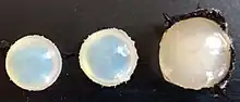 As development progresses, the lens placode begins to deepen and bow inwards. As the placode continues to deepen, the opening to the surface ectoderm constricts[14] and the lens cells bud off from the embryo's skin to form a sphere of cells known as the "lens vesicle". When the embryo is about 10mm long the lens vesicle has completely separated from the skin of the embryo.