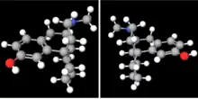 Chemically, levorphanol belongs to the morphinan class and is (−)-3-hydroxy-N-methyl-morphinan.[9] It is the "left-handed" (levorotatory) stereoisomer of racemorphan, the racemic mixture of the two stereoisomers with differing pharmacology. The "right-handed" (dextrorotatory) enantiomer of racemorphan is dextrorphan (DXO), an antitussive, potent dissociative hallucinogen (NMDA receptor antagonist), and weakly active opioid. DXO is an active metabolite of the pharmaceutical drug dextromethorphan (DXM), which, analogously to DXO, is an enantiomer of the racemic mixture racemethorphan along with levomethorphan, the latter of which has similar properties to those of levorphanol.