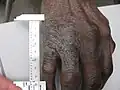 Lichen simplex chronicus (LSC) is thick, leathery skin with exaggerated skin markings caused by sudden itching and excessive rubbing and scratching.[1] It generally results in small bumps, patches, scratch marks, scale and prominence of the normal skin markings.[1] It typically affects the neck, scalp, upper eyelids, ears, palms, soles, ankles, wrists, genital areas and bottom.[1] It typically develops gradually and the scratching becomes a habit.[1]