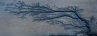 A lightning strike can also create a large Lichtenberg figure in grass surrounding the point struck. These are sometimes found on golf courses or in grassy meadows.[12] Branching root-shaped "fulgurite" mineral deposits may also be created as sand and soil is fused into glassy tubes by the intense heat of the current.