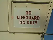 - Swimming pool – Swimming pools of various sizes are oftentimes monitored by lifeguards, however some pools may not require monitoring as due to the size of the pool, or the patron attendance being too low. A sign indicating that "Lifeguard not on duty" will be present in this case.