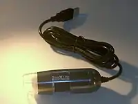 Low-powered digital microscopes, USB microscopes, are also commercially available. These are essentially webcams with a high-powered macro lens and generally do not use transillumination. The camera is attached directly to a computer's USB port to show the images directly on the monitor. They offer modest magnifications (up to about 200×) without the need to use eyepieces and at a very low cost. High-power illumination is usually provided by an LED source or sources adjacent to the camera lens.