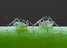 Reed aphids ingesting plant sap]] The Lily Mottle virus is transmitted during the feeding act of aphids (Aphididae). The aphids ingest the virus, which is present in high concentrations in the plant sap, during the feeding act and can infect other plants with a delay of a few hours. The virus cannot multiply in the aphid itself. After absorption of the plant sap into the aphid's midgut, the virus is distributed in the bloodstream and enters the saliva of the sucking apparatus; a new plant can then be infected during the next feeding. The aphid species that predominantly transmit LMoV are Aphis gossypii, Myzus persicae, Macrosiphum euphorbiae and Doralis fabae. Stored bulbs can also be infected with the virus by Anuraphis (Yezabura) tulipae.[15] Winged specimens of the aphid population enable transmission over long distances.