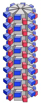 Virus particles (virions) of the Lily mottle virus consist of a thread-like capsid with helical symmetry, in which a single-stranded RNA is packed as a genome; a viral envelope is not present.[3] The capsid is 13 nm thick and about 740 nm long. The length of the capsid increases in the presence of divalent cations (especially calcium ions) in the preparation and decreases after binding by the addition of EDTA. The individual capsomeres that make up the capsid require a pitch of 3.4 nm for one helix turn. Compared to viruses with rigid rods and a comparable structure (e.g. the Tobacco mosaic virus- TMV), this duct height is relatively large and enables the LMoV capsid to be flexible and bendable. One turn requires 7.7 capsomeres, so that the entire capsid is composed of about 1700 capsomeres.[4] The individual capsomeres consist of only one molecule of the LMoV capsid protein (CP, coat/capsid protein) with a length of 274 amino acids (33 kDa). The CP is folded several times in such a way that the N- and C-terminus point outwards. These outer ends of the capsid protein are very variable. The protruding N-terminus mainly determines the specific attachment to the host cell and enables the serological differentiation of different virus isolates. The highly conserved sections in the middle of the CP (216 amino acids) within the different members of the Potyviridae point inwards in the capsid and interact with the viral RNA.[5]