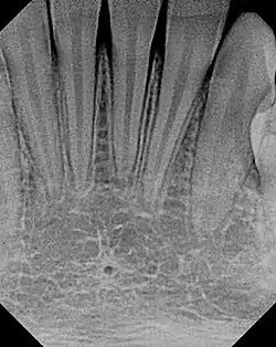 The small lingual foramen (black "hole" in lower portion of picture) as seen on a periapical radiograph of the anterior mandible.